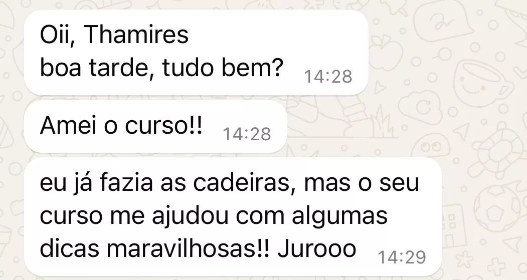 Já na primeira semana, você poderá criar sua primeira cadeira com cordas e aplicar os gráficos prontos. Com dedicação, em poucas semanas você estará pronta para vender!